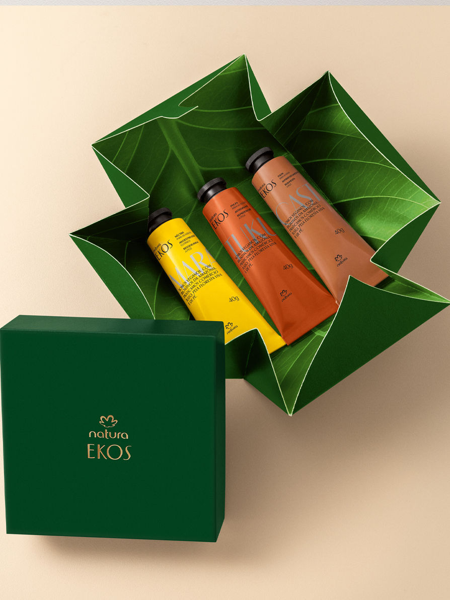 Este presente vem com 3 polpas para nutrir e hidratar as mãos. Diferentes fragrâncias que celebram a Amazônia e sua potência biocosmética. Acompanha uma caixa com formato surpreendente de folha.