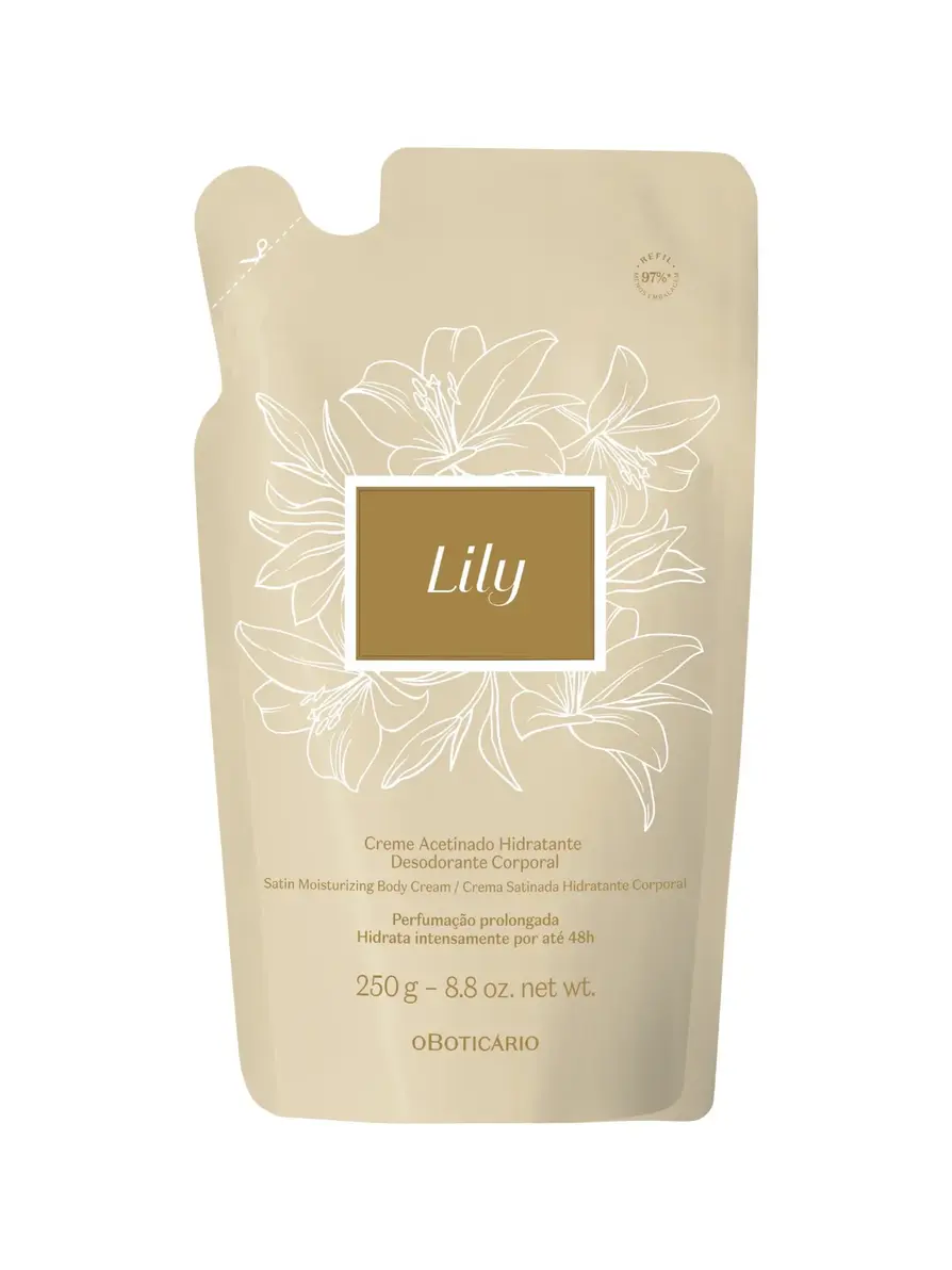 O Refil Creme Acetinado Hidratante Desodorante Corporal Lily entrega perfumação prolongada e fragrância intensa para sua pele na medida certa.